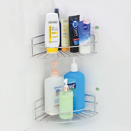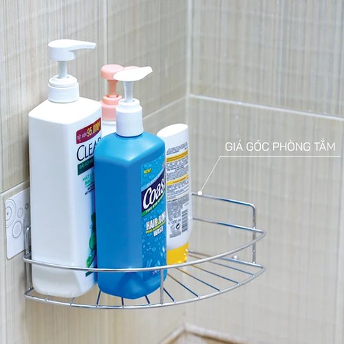 Giá góc có thể sắp theo hình bán nguyệt theo tầng để toàn bộ đồ dùng và vật dụng nhà tắm: sữa tắm, dầu gội, sữa rửa mặt, dưỡng thể...