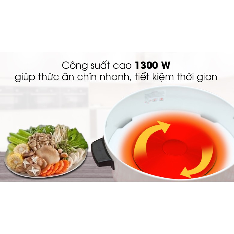 Lẩu điện có một mâm nhiệt lớn giúp truyền nhiệt nhanh và đều, cùng công suất cao 1300W giúp nấu chín thức ăn nhanh chóng, tiết kiệm thời gian nấu nướng.