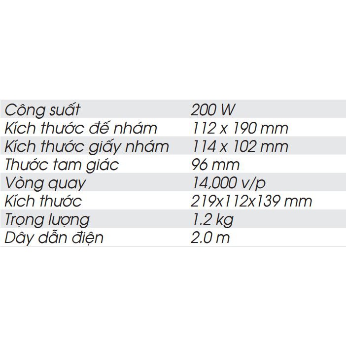 Phụ kiện đi kèm: Giấy nhám, túi chứa bụi.
