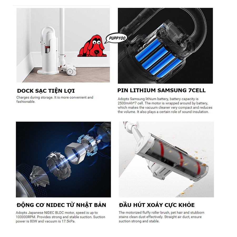 Giới thiệu [HÀNG CHÍNH HÃNG] Máy Hút Bụi Cầm Tay Không Dây Cao Cấp PUPPYOO T10 Pro Lực Hút 17500 Pa Bảo Hành 24 Tháng