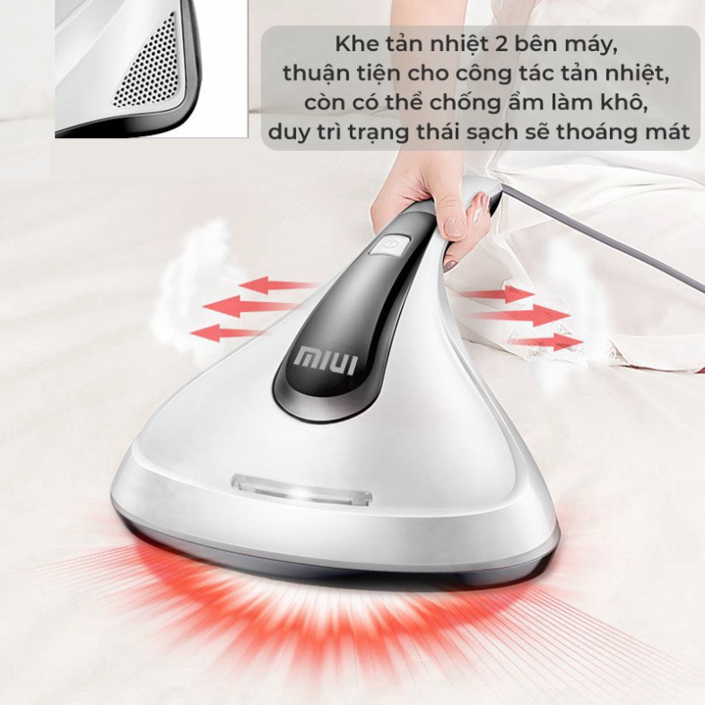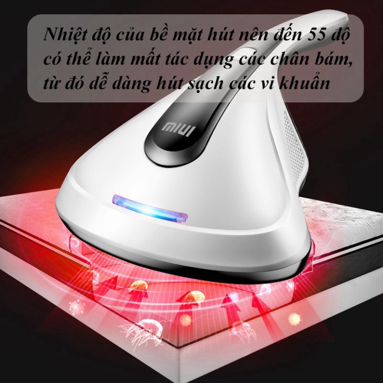 Máy hút bụi diệt khuẩn cầm tay MIUI SC2905 thiết kế hệ thống quang nhiệt PTC nóng 55 độ C cùng tia UV hoạt động rung với tần số cao (8000lần/phút) nhằm ức chế các loại vi khuẩn, bọ chét bám trên từng thớ vải, làm khô nhanh chóng bề mặt, hạn chế phát sinh vi khuẩn ở một khoảng thời gian sau đó.