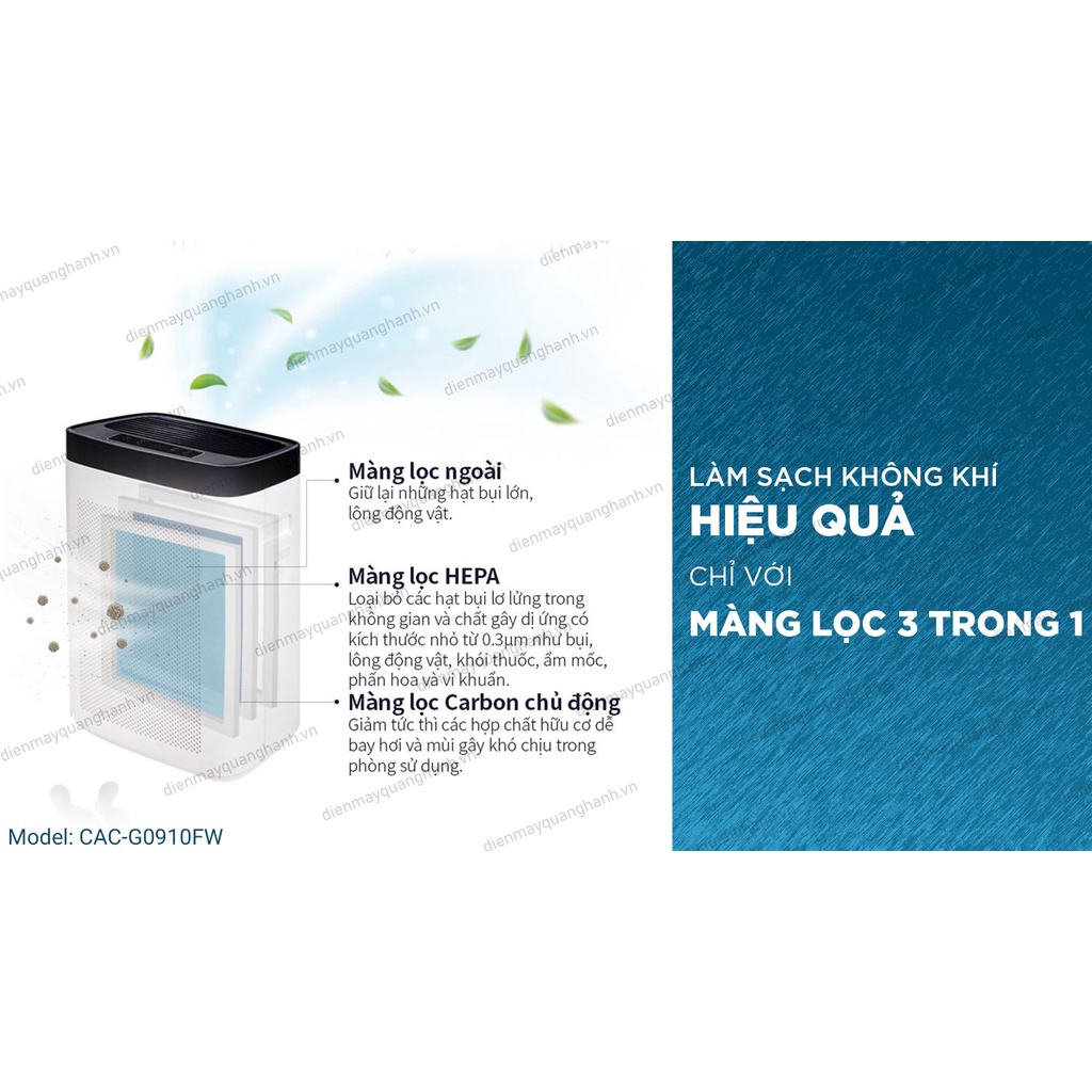 Máy lọc không khí gia đình CAC-G0910FW thiết kế 3 đèn Led cảnh báo chất lượng không khí, giúp bạn biết được gia đình mình có đang ở không gian an toàn không. Từ đó mà có thể khởi động chức năng lọc sạch để không gian luôn được thoáng đãng.