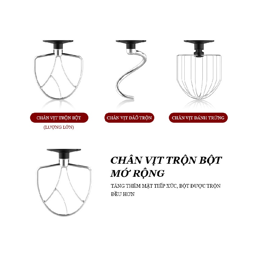 - Phụ kiện: chân vịt trộn bột, chân vịt đảo trộn và chân vịt đánh trứng