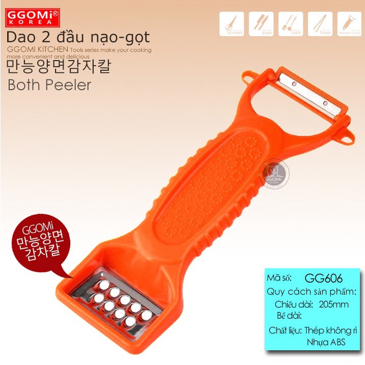 ✨Nạo bào vỏ củ quả 2 đầu GGOMi Hàn Quốc GG606 có tay cầm bằng nhựa ABS tiện lợi sử dụng được cho người thuận cả tay trái lẫn tay phải, trên lưỡi dao được thiết kế dập nổi và in logo thương hiệu GGOMi tránh hàng nhái, hàng giả, lưỡi bào được sử dụng bằng vật liệu thép không gỉ an toàn với sức khỏe của con người khi sử dụng sản phẩm. Sản phẩm sử dụng để bào nạo trái cây, củ quả để chế biến thực phẩm,....