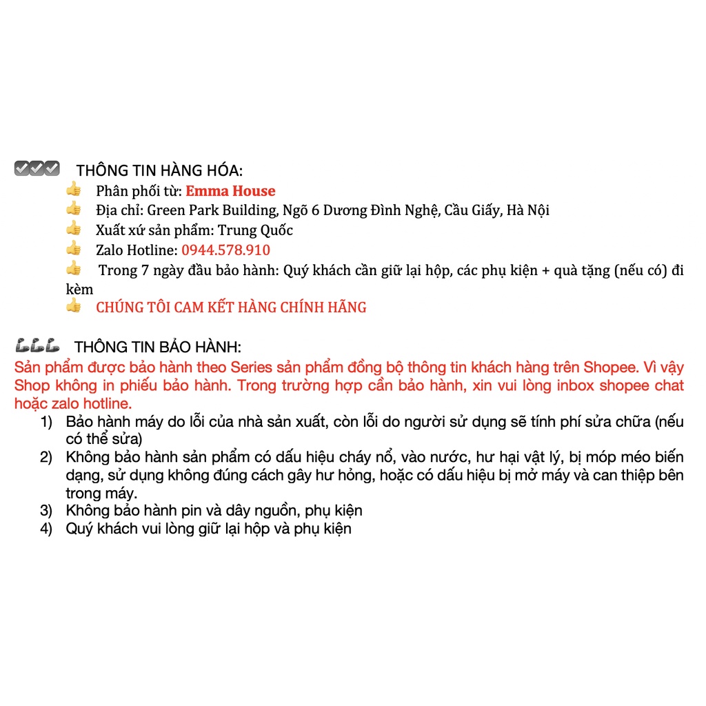 3) Không bảo hành pin và dây nguồn, phụ kiện