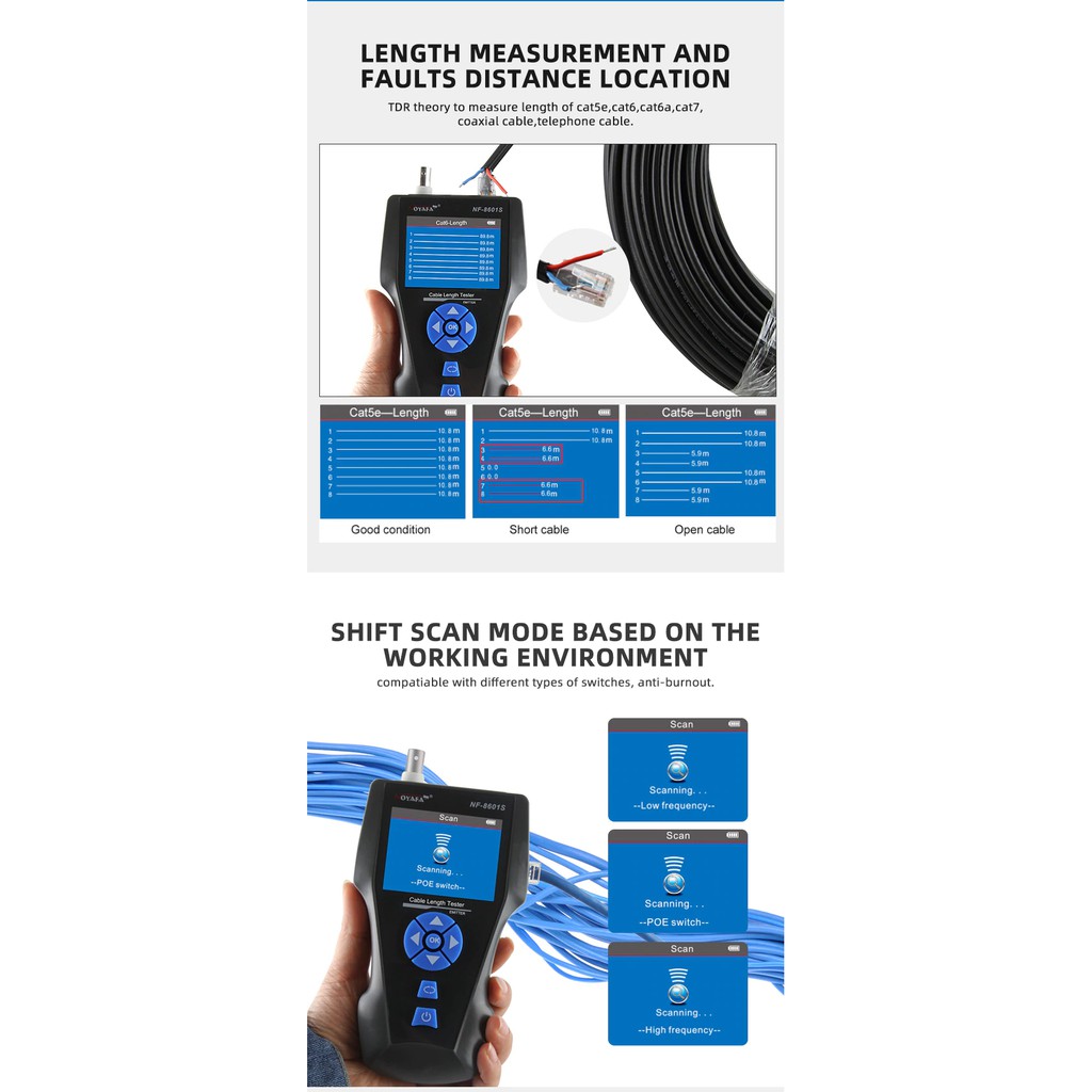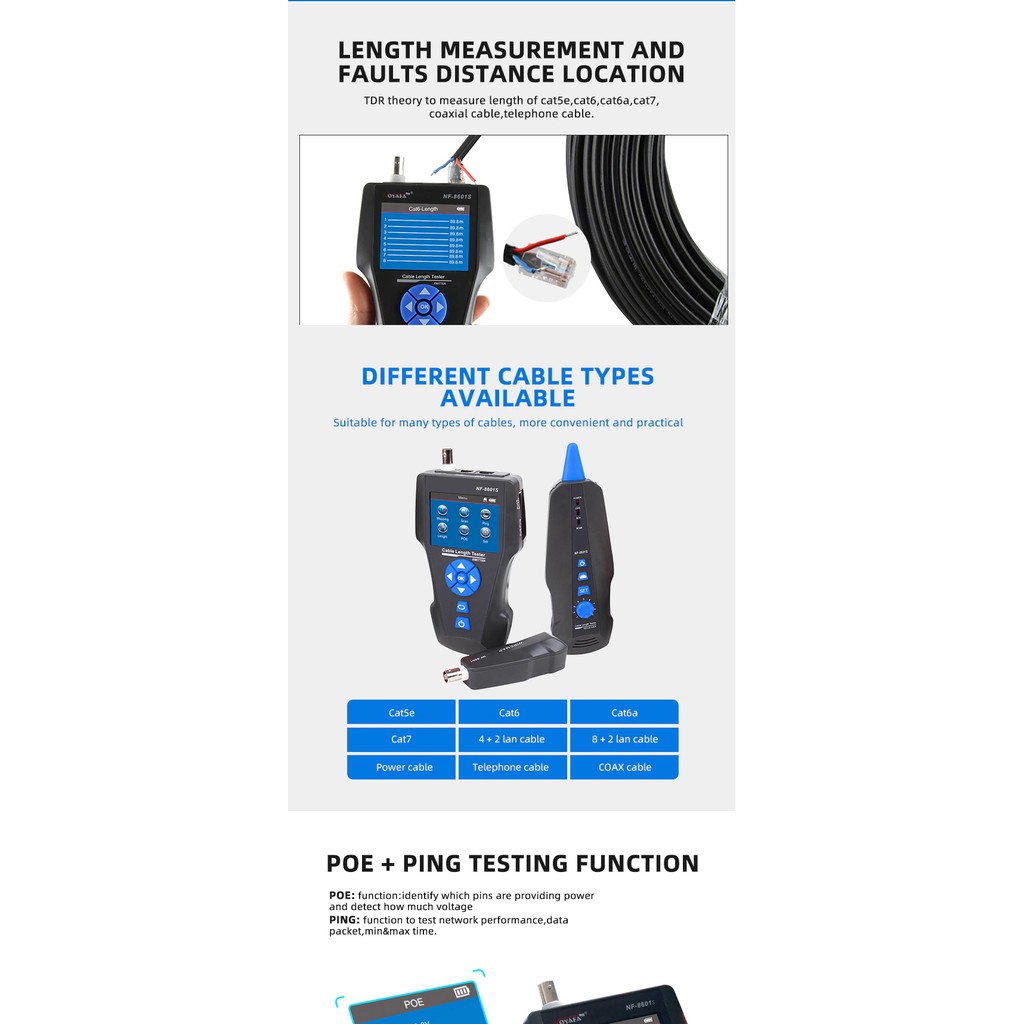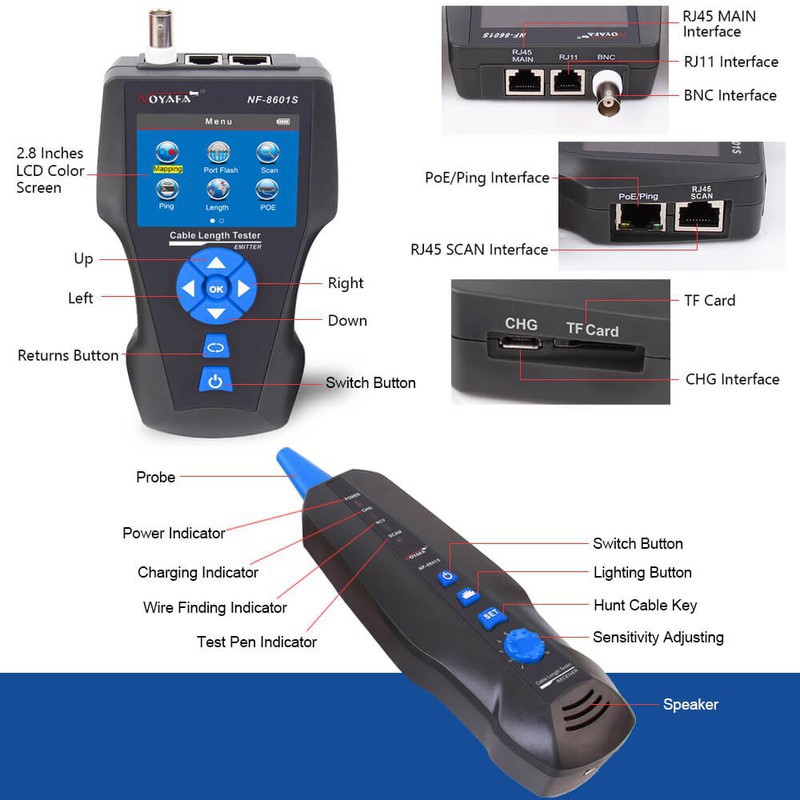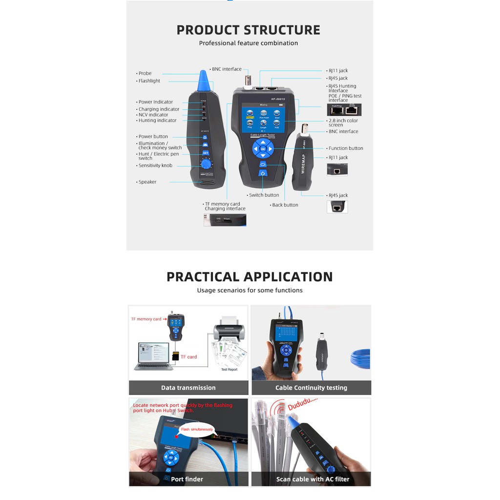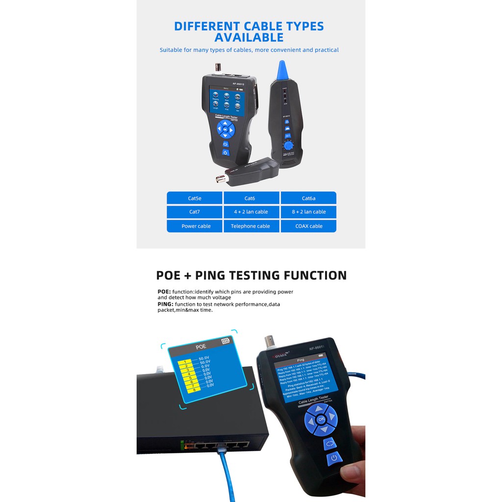 [HÀNG CHÍNH HÃNG] THIẾT BỊ TEST MẠNG HỘP TEST MẠNG NOYAFA NF-8601SCHỨC NĂNG: