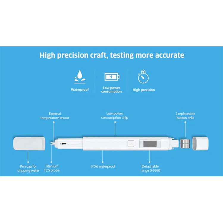 Bút đo độ cứng của nước, bút đo độ cứng TDS, bút đo TDS, bút đo độ dẫn điện EC, bút TDS xiaomi là thiết bị tuyệt vời cho bạn trong việc kiểm tra nguồn nước.Bút thử nước và nồng độ chất hóa học trong nước uống và nước sinh hoạt, sản phẩm bút TDS Xiaomi sẽ cho bạn kết quả kiểm tra chính xác nhất trong thời gian rất ngắn, chỉ với vài thao tác đơn giản, bạn đã có thể dễ dàng kiểm tra các nồng độ chất rắn hòa tan, xác định được mức độ thẩm thấu cũng như ảnh hưởng của nguồn nước tới mức độ an toàn cho sức khỏe của bạn khi sử dụng nguồn nước uống, nước sinh hoạt, nước từ máy lọc nước hoặc bất kỳ nguồn nước nào khác.