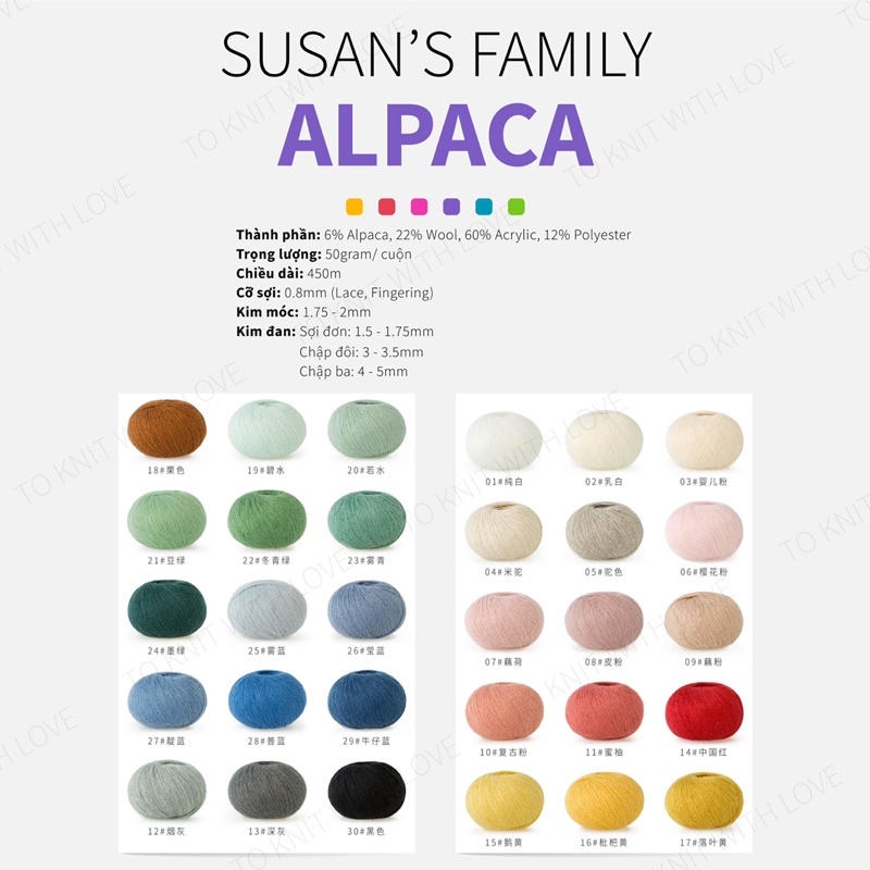 Mùa đông năm nay nhất định mọi người phải thử dòng len Alpaca này của Susan's Family nhéee! Pen Alpaca đặc tính giữ ấm tốt, xốp, nhẹ và rất dôi. 1c 50g nhưng dài tận 450m 😱