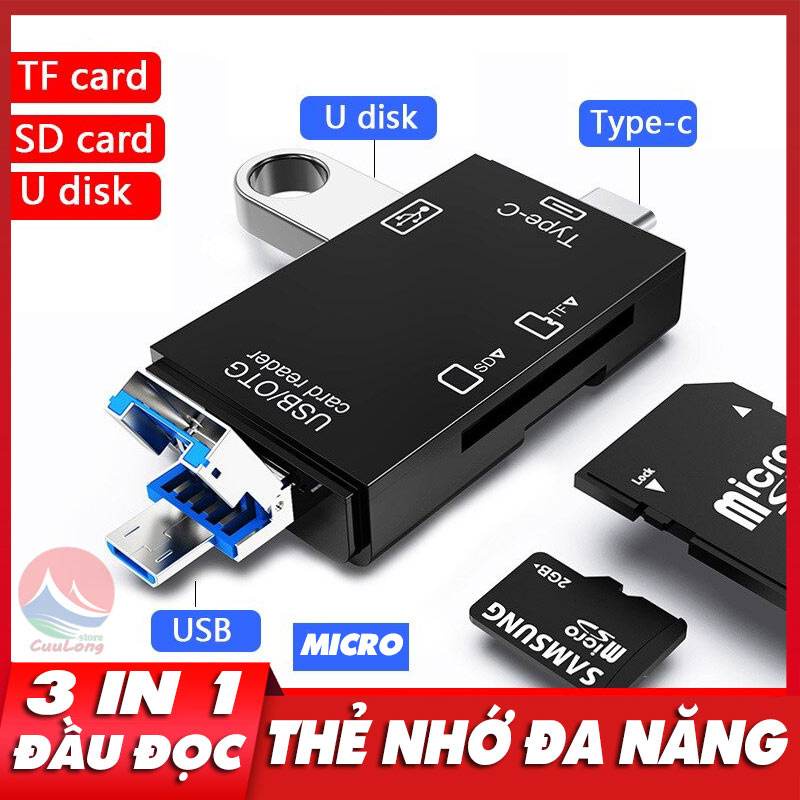 ĐẦU ĐỌC THẺ NHỚ ĐA NĂNG OTG 3 TRONG 1Dùng Để Đọc Thẻ Nhớ Micro SD Card USB Gắn Ngoài Cho Điện Thoại Máy Tính, Tích Hợp 3 Cổng Cắm USB 2.0/Type C/Micro USB Đa Năng Giúp Bạn Cắm Được Hầu Hết Các Dòng Máy Android Laptop PC. Đọc Được Thẻ Nhớ Lên Đến 500G, Nhỏ Gọn Bỏ Túi Mang Đi Dễ Dàng.
