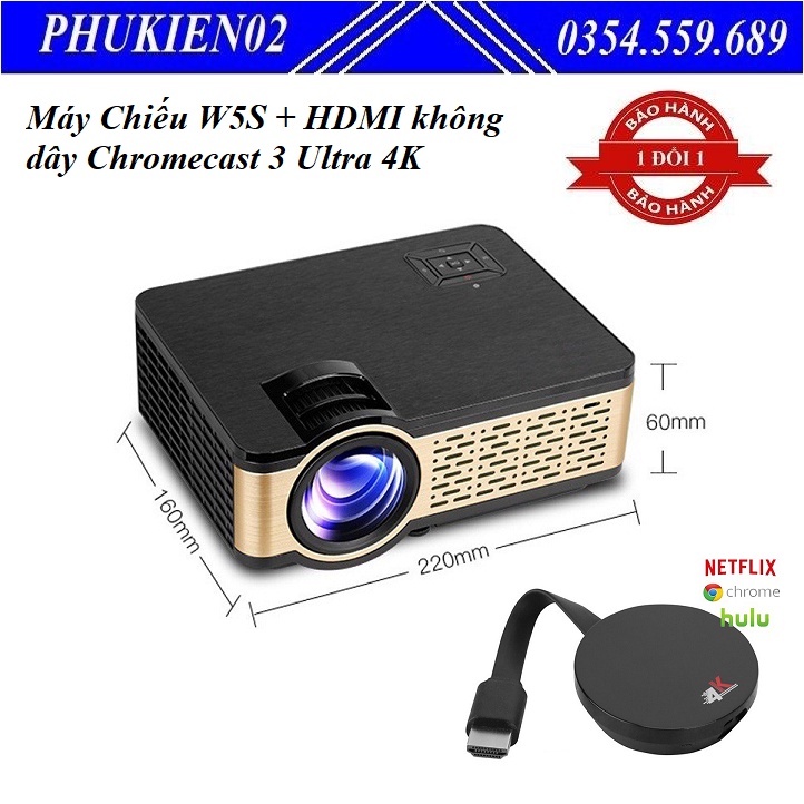 [ Chính hãng ] Combo Máy Chiếu Hỗ Trợ Tiếng Việt Thế Hệ Mới W5S + Thiết bị HDMI không dây Chromecast 3 Ultra 4K
