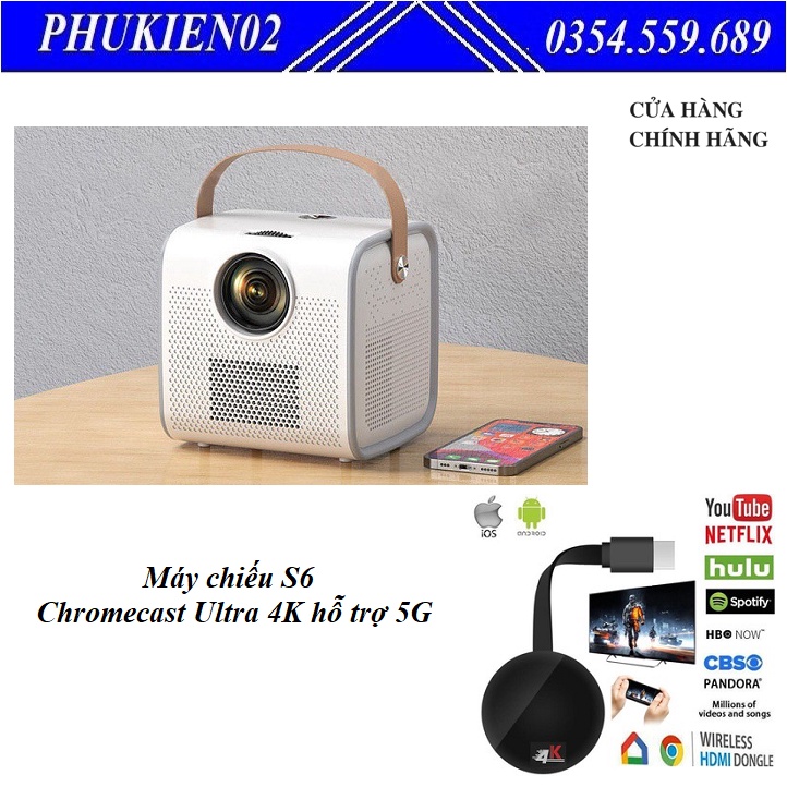 [ Chính hãng ] Combo Máy chiếu siêu nhỏ gọn, siêu tiện lợi S6 + HDMI không dây Chromecast Ultra 4K hỗ trợ kết nối 5G