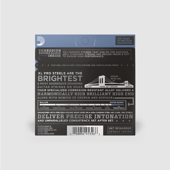 D'Addario XL ProSteels sử dụng hợp kim thép không gỉ độc quyền cho âm sắc siêu sáng mà không bị overtones chát tai. Tạo được âm cao sáng, âm trầm hài hoà, kết hợp với âm thấp rõ. ProSteels là sự lựa chọn lý tưởng cho người chơi đang cần thêm âm ngân. Sáng, to và mạnh, dây đàn mang đến sự thay thế tuyệt vời cho nickel để có âm thanh sắc nét hơn. EPS510 regular light gauge set như mọi dây guitar D'Addario, đi kèm bao bì chống ăn mòn thân thiện với môi trường tạo nên sự tươi mới.