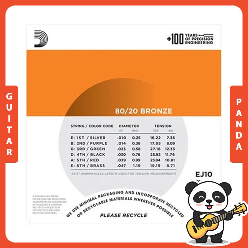 Dây Guitar Acoustic - D'Addario EJ10 là dòng sản phẩm dây đồng (Bronze) của hãng D'Addario (Mỹ), kích cỡ 10-47, đây là mẫu dây đàn guitar acoustic có kích cỡ nhỏ nhất của hãng, loại Extra Light, thiết kế dành cho người chơi là những người mới tập (beginner) hoặc người chơi yêu thích dây có độ căng nhỏ, dễ bấm và dễ bend dây.