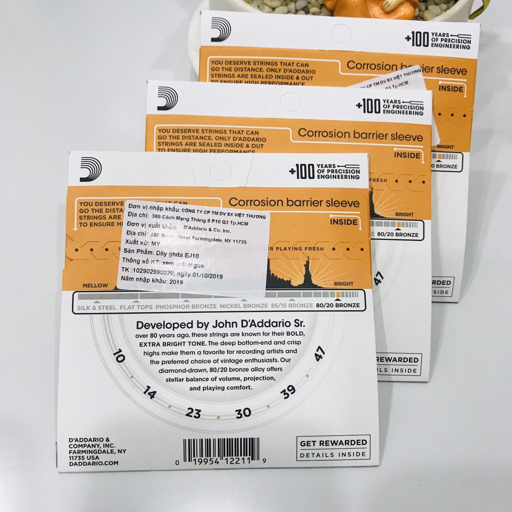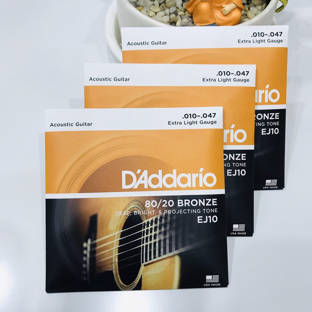 -Dây Guitar Acoustic - D'Addario EJ10 là dòng sản phẩm dây đồng (Bronze) của hãng D'Addario (Mỹ), kích cỡ 10-47, đây là mẫu dây đàn guitar acoustic có kích cỡ nhỏ nhất của hãng, loại Extra Light, thiết kế dành cho người chơi là những người mới tập (beginner) hoặc người chơi yêu thích dây có độ căng nhỏ, dễ bấm và dễ bend dây-Dây đồng (Bronze Acoustic Guitar Strings) còn được gọi là dây 80/20 với ý nghĩa tỷ lệ đồng chiếm 80% thành phần cấu tạo từng sợi dây (20% còn lại là kẽm hoặc thiếc), đây chính là mẫu dây kim loại đầu tiên thiết kế dành cho đàn guitar acoustic. Vào những năm 1930, John D'Addario Sr. và John D'Angelico lựa chọn dây đồng cho một kế hoạch phát triển thương hiệu D'Addario quy mô và bền vững, chúng ngay lập tức trở nên phổ biến, được ghi nhận là có chất âm sâu & rõ tiếng, ngoài ra chúng còn nhận được nhiều tình cảm từ những người chơi yêu thích các thiết kế truyền thống với bề dày lịch sử lâu dài.