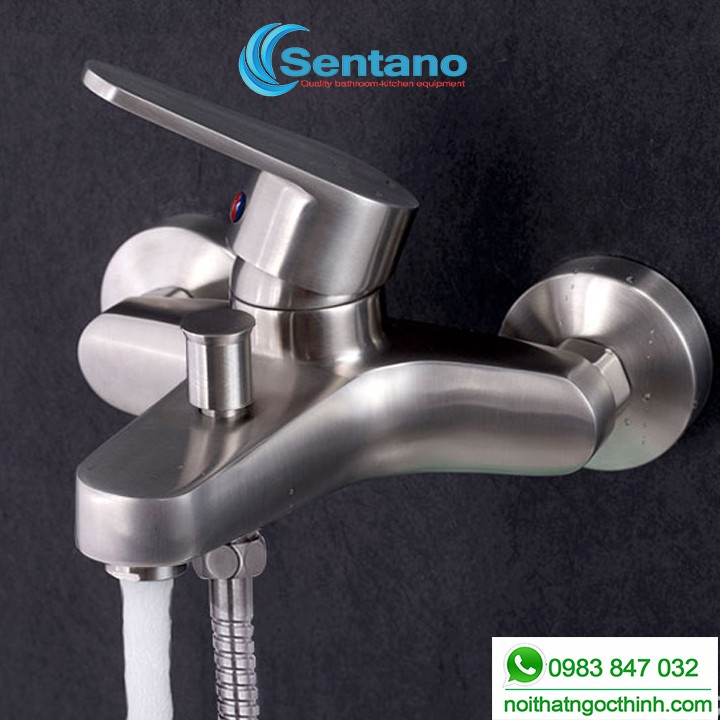 - sen tắm nóng lạnh Sentano thiết kế dễ dàng sử dụng và thao tác. Trên củ sen có phần tay gạt đóng mở. Gạt qua phải sẽ cho dòng nước lạnh chảy ra, gạt bên trái là dòng nước nóng. Gạt về giữa là trộn giữa 2 dòng nước nóng và lạnh để cho nước ấm. Khách điều chỉnh nhiệt độ ấm vừa phải bằng cách xoay nhẹ tay theo hướng phù hợp.
