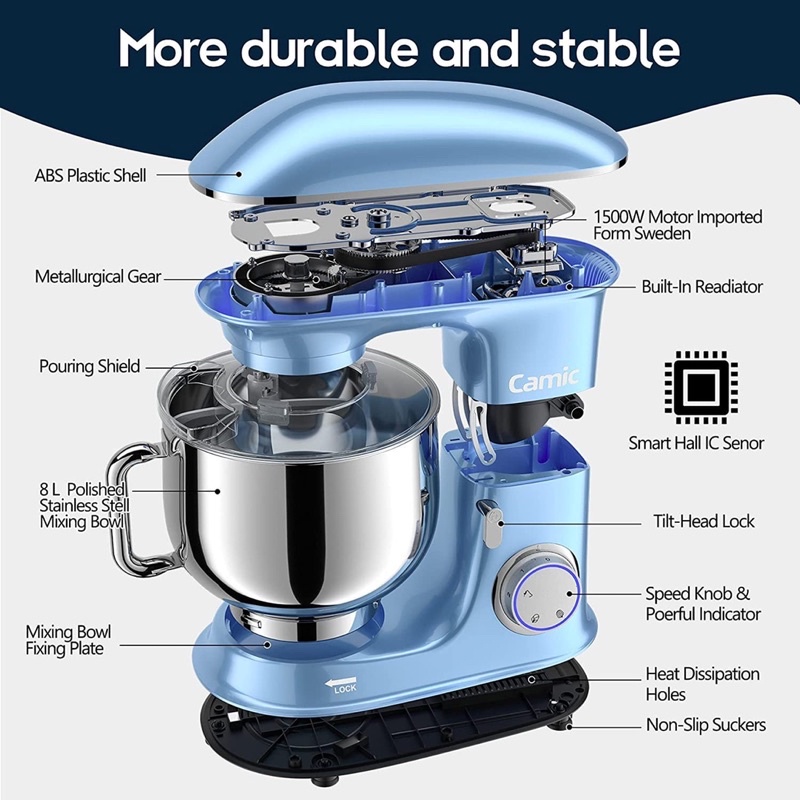 Sản phẩm: Máy nhào bột CAMIC 8L 1500W SM-1552 với bánh răng bằng kim loại đúc chắc chắn và thiết kế dây curoa, nên có khả năng nhào được số lượng lớn bột. Bạn có thể sử dụng cho gia đình hoặc kinh doanh nhỏ.