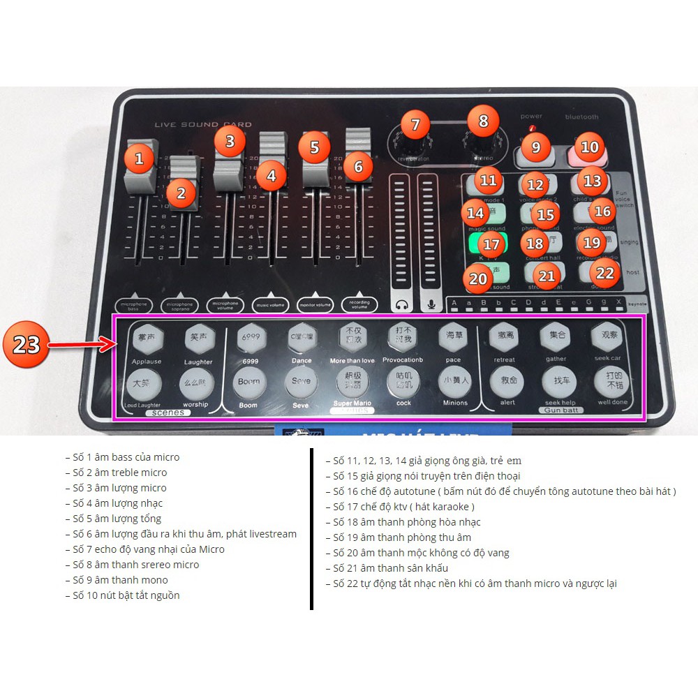 - Sound card H9 có đầy đủ các tính năng như các đàn anh đi trước như chế độ Autotune, giả giọng người già trẻ em, hiệu ứng âm thanh khan giả ( tiếng cười, vỗ tay, reo hò, nhạc nền … ).