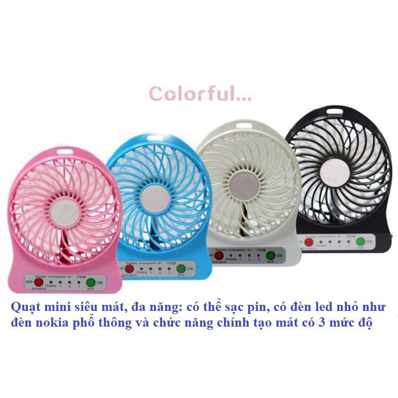 Quạt Sạc Cầm Tay 4 Tốc Độ có thiết kế nhỏ gọn, thuận tiện mang theo trong các buổi đi học, cắm trại, các chuyến du lịch, dã ngoại…, khi mất điện, cầm tay và tiện nhất là để bàn học, bàn làm việc, gắn nôi em bé…