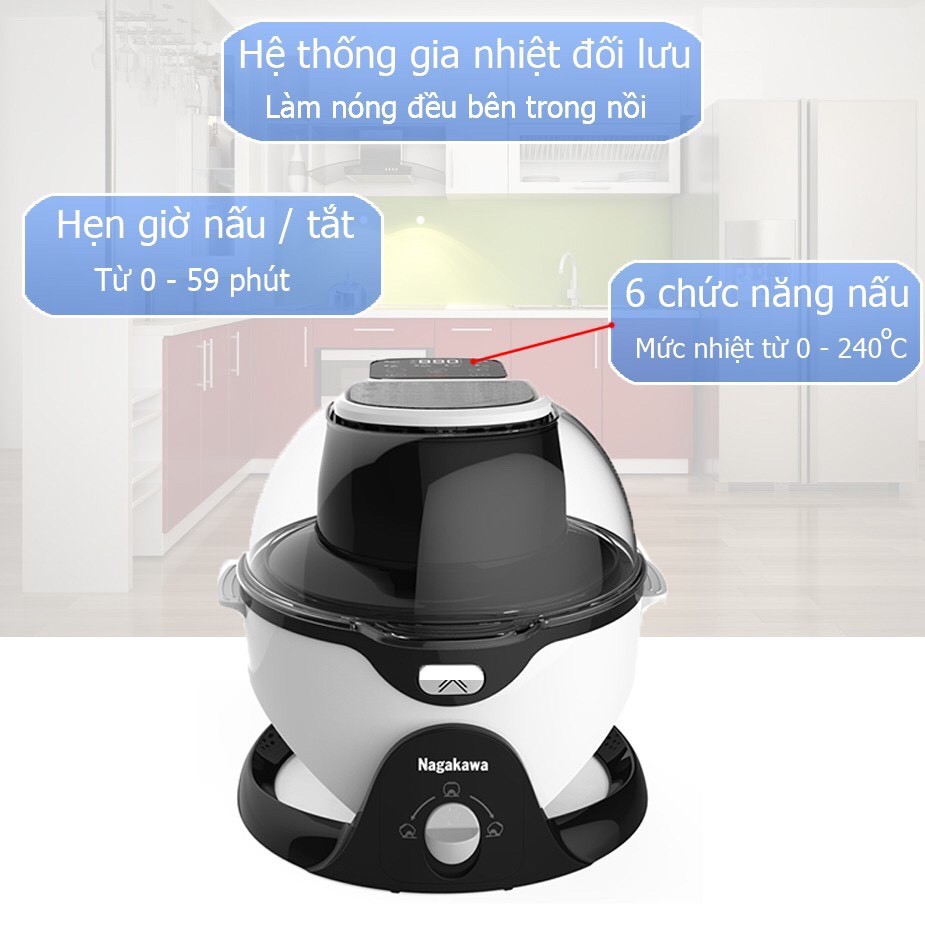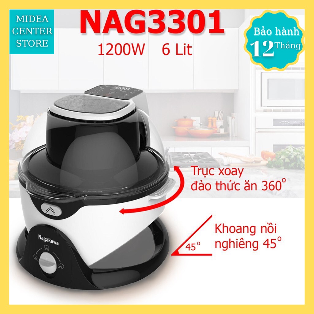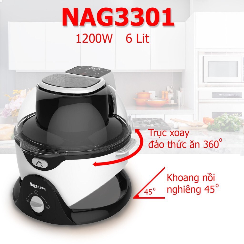 Giới thiệu [Chính Hãng] Lò Nướng/Nồi chiên không dầu 6lít Nagakawa NAG3301, trục nghiêng tùy ý tự động đảo 360 độ, BH 12 tháng
