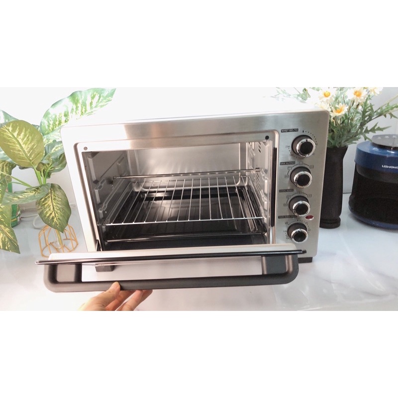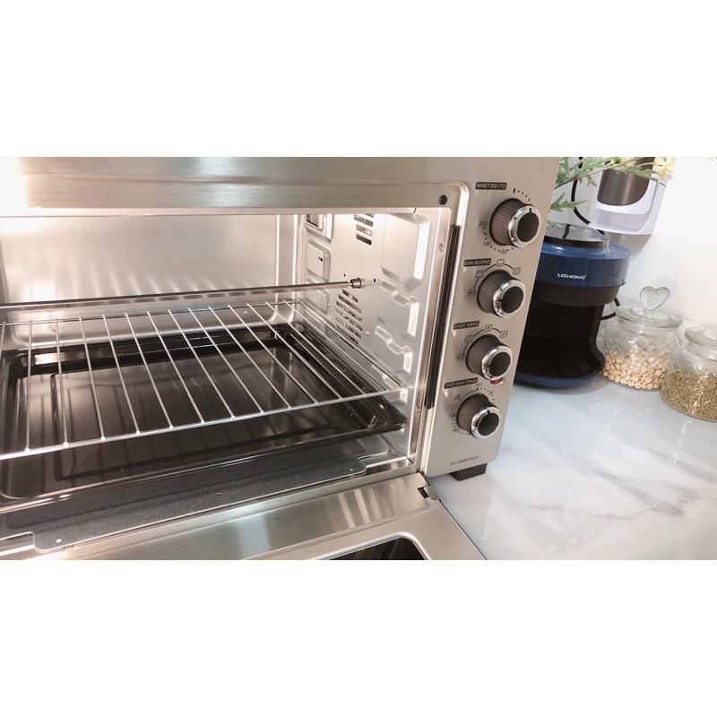 ● Tặng kèm lò có khay nướng, khay Pizza, khay hứng, vỉ nướng, xiên quay, tay cầm xiên quay, tay cầm khay nướng