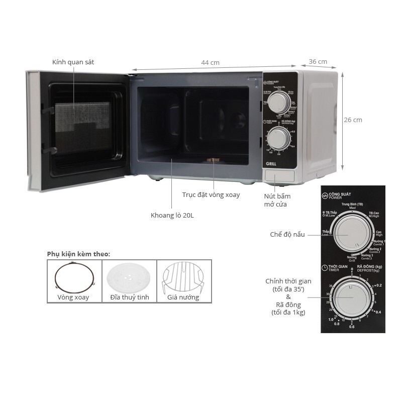 - Chức năng chính: Rã đông, hâm, nấu, nướng