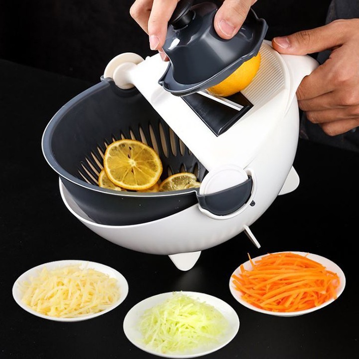 Bộ Dụng Cụ Thông Minh Nạo Rau - Củ - Quả Kèm Rổ 9 Trong 1 Đa Năng thiết kế thông minh, nhỏ gọn và nhiều chức năng với cấu tạo gồm: lưỡi gọt (nạo) vỏ củ quả (củ khoai tây, bầu, bí, cà rốt, mướp, susu…); lưỡi bào (cắt) củ quả thành sợi nhỏ (Bào cà rốt, đu đủ, dừa…); rổ hứng rửa xoay 360 độ không lo bị rơi ra ngoài… giúp việc chế biến các món ăn thật đơn giản và dễ dàng và đẹp mắt.