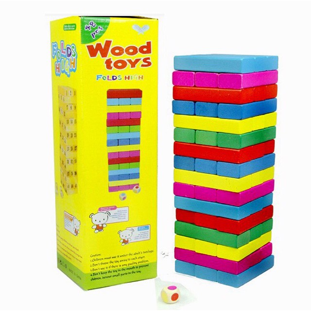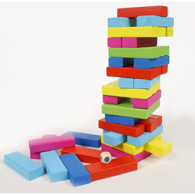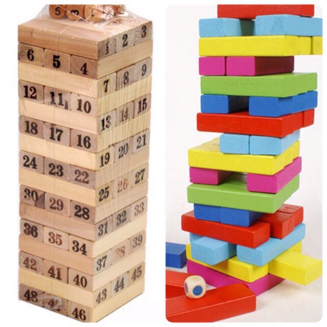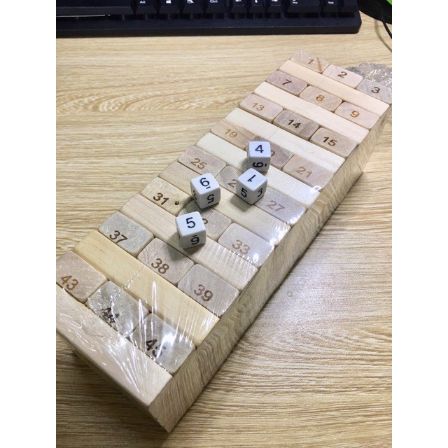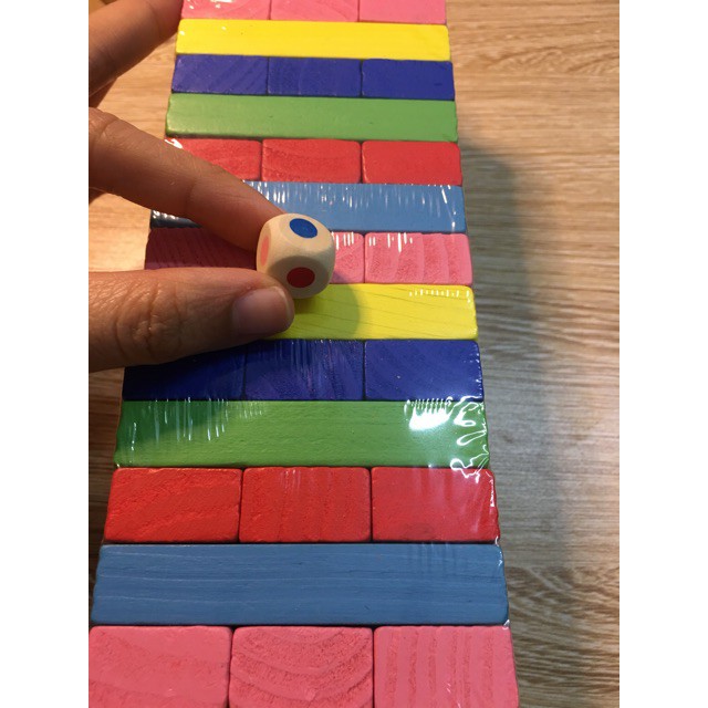 Bộ đồ chơi gồm 48 thanh gỗ màu sắc hoặc có in số và xúc xắc.