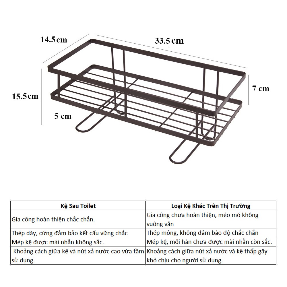 - Sản phẩm Kệ Để Đồ Sau Toilet KUNBE là sản phẩm giúp sắp xếp đồ dùng trong phòng tắm, phòng vệ sinh gọn gàng hơn, bạn có thể để dầu gội, kem dưỡng da, sữa rửa mặt, giấy vệ sinh,… vào kệ giúp phòng tắm của bạn tối ưu được diện tích và ngăn nắp, không còn nỗi lo nhà tắm chật chội hay vướng víu bởi các đồ dùng.