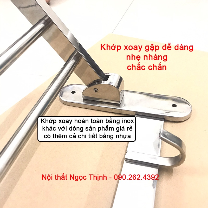 - Khung kệ dễ dàng gập lên gập xuống nhẹ nhàng nhờ 2 khớp xoay 2 bên, khớp xoay bằng inox không có pha chi tiết nhựa như sản phẩm dòng giá rẻ. Nên sử dụng lâu dài cực kỳ bền, không lo mòn hay trờn ở khớp xoay