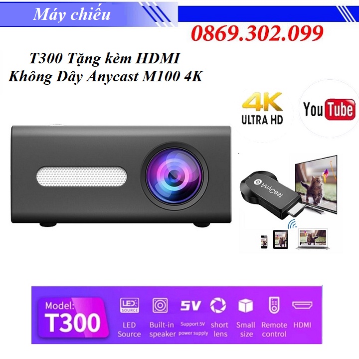 [ Chính hãng ] Máy Chiếu Di Động Mini Led Projector T300 Tặng kèm Thiết Bị Kết Nối HDMI Không Dây Anycast M100 4K