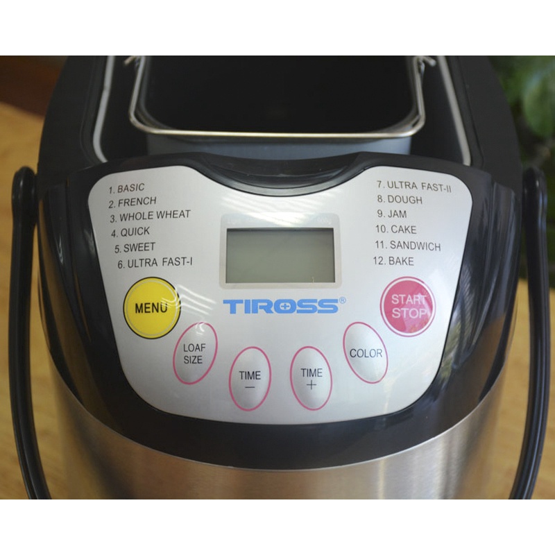 - Máy Làm Bánh Mì Tiross 12 Chức Năng TS821 gồm 12 chức năng làm bánh, 3 mức điều chỉnh màu bánh, chức năng hẹn giờ lên đến 13 tiếng và giữ ấm 60 phút sau khi bánh chín. Thân máy bằng inox siêu bền và mang lại vẻ sang trọng. Với máy làm bánh mì Tiross TS821 bạn sẽ nhanh chóng có những chiếc bánh mì nóng nổi để ăn kèm với mứt, thịt nguội, trứng chiên, xà lách... Như vậy không mất quá nhiều thời gian, bạn đã chuẩn bị xong bữa sáng ngon miệng và dinh dưỡng cho gia đình mình.
