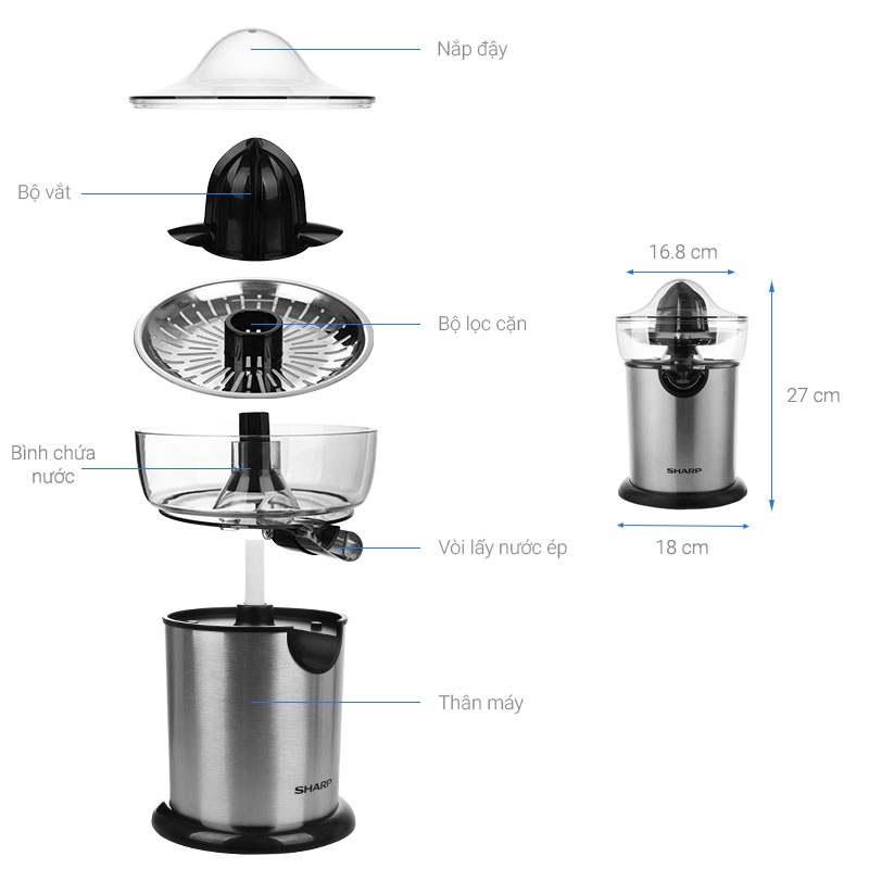 [Chính Hãng] Máy vắt cam inox cao cấp Sharp EJ-J130-ST, Lỗi 1 đổi 1, bảo hành 12 tháng toàn quốcThông số kỹ thuật Máy vắt cam Sharp 130W EJ-J130-ST