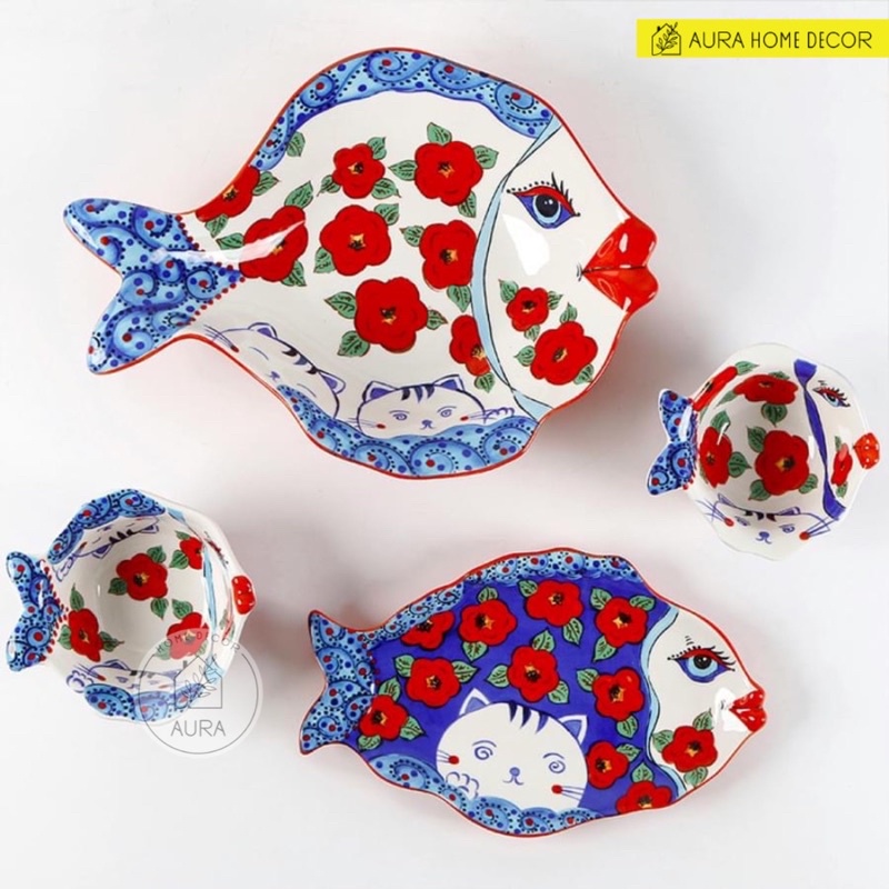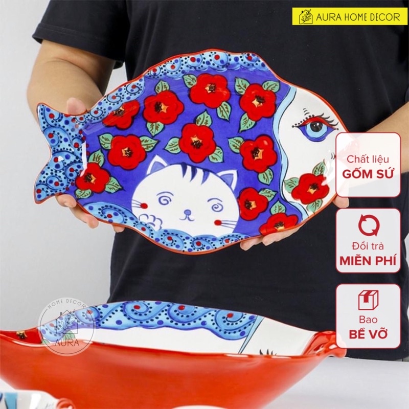 [HÀNG MỚI - CÓ SẴN] Bát, tô, đĩa gốm sứ mỹ nghệ Âu Mỹ OMK hình cá sặc sỡ - Hoạ tiết hoa đỏ xanh, sống động tươi sáng