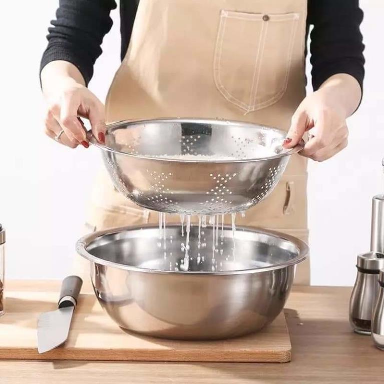 Bộ thau rổ có thiết kế đơn giản hình tròn với vành trên chắc chắn , chất liệu inox giữ cho đồ dùng, thực phẩm, rau củ quả luôn sạch sẽ, vệ sinh. Các lỗ nhỏ trên thân rổ giúp thực phẩm đựng bên trong nhanh chóng khô ráo.