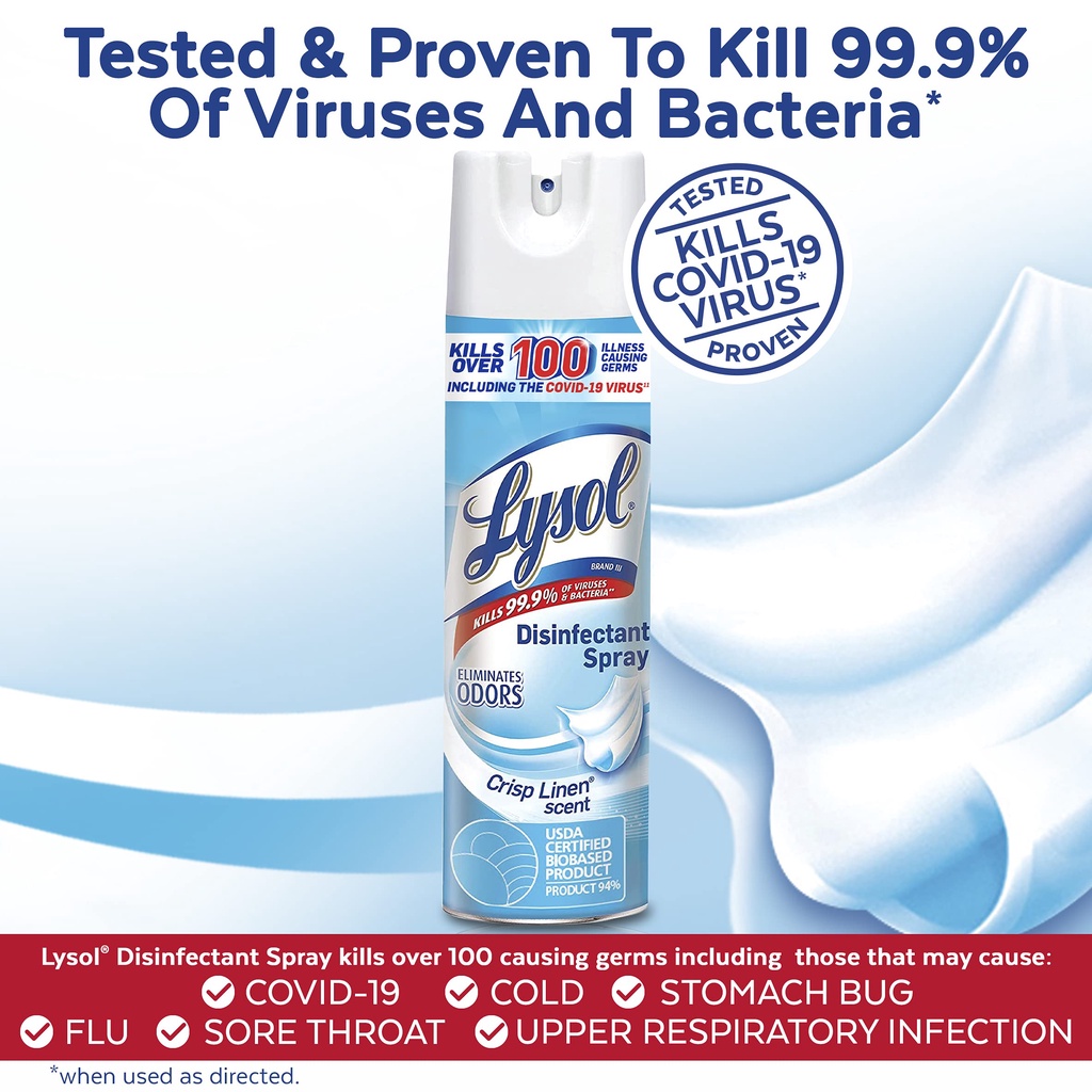 Xịt diệt khuẩn Lysol Disinfectant Spray 538gr , là sản phẩm giúp tiêu diệt 99,9% các virus và vi khuẩn ở những nơi ẩm mốc trong nhà của bạn. Ngăn chặn mùi hôi và ngăn sự hình thành, tăng trưởng của nấm mốc, loại bỏ các vi khuẩn gây bệnh cảm lạnh, cảm cúm …Được sản xuất bằng nguyên liệu an toàn và phù hợp với trẻ sơ sinh và người lớn, sản phẩm được nhập khẩu chính hãng của tập đoàn RB