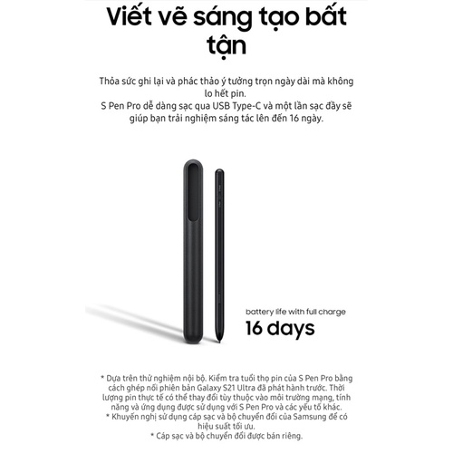 * Dựa trên thử nghiệm nội bộ. Kiểm tra tuổi thọ pin của S Pen Pro bằng cách ghép nối phiên bản Galaxy S21 Ultra đã phát hành trước. Thời lượng pin thực tế có thể thay đổi tùy thuộc vào môi trường mạng, tính năng và ứng dụng được sử dụng với S Pen Pro và các yếu tố khác.