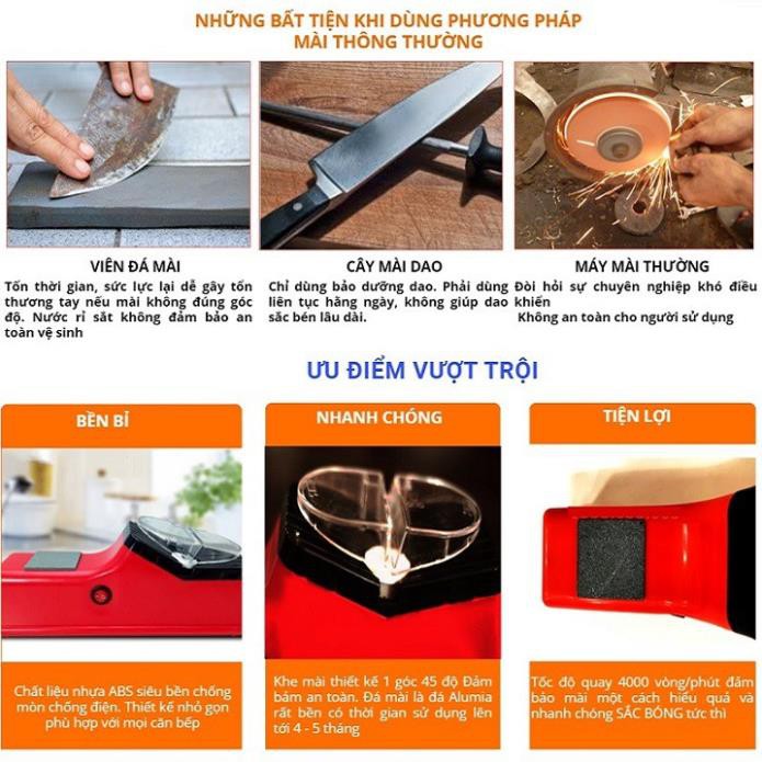 - Máy mài dao kéo không làm mất lưỡi dao, dễ dàng sử dụng, không mất nhiều thời gian: Chỉ với 5 – 8 giây dao kéo đã sắc ngọt và sáng bóng.