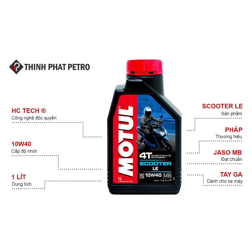 - Motul Scooter LE 10W40 1L đến từ hãng dầu nhớt Motul danh tiếng tại Pháp, là sản phẩm dầu nhớt đặc biệt dành cho xe tay ga 4 thì đời mới. Motul Scooter LE 10W40 1L tự hào được nhiều nhà sản xuất xe khuyến cáo nên dùng cho các động cơ xe tay ga mới hiện nay.