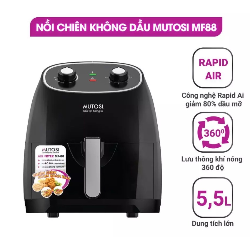- Nồi thiết kế đa chức năng, không chỉ tuyệt vời khi rán, nồi chiên không dầu Mutosi MF88 đổi mới với công nghệ Rapid Air còn cho phép bạn quay, nướng bánh và nướng những món ăn ưa thích