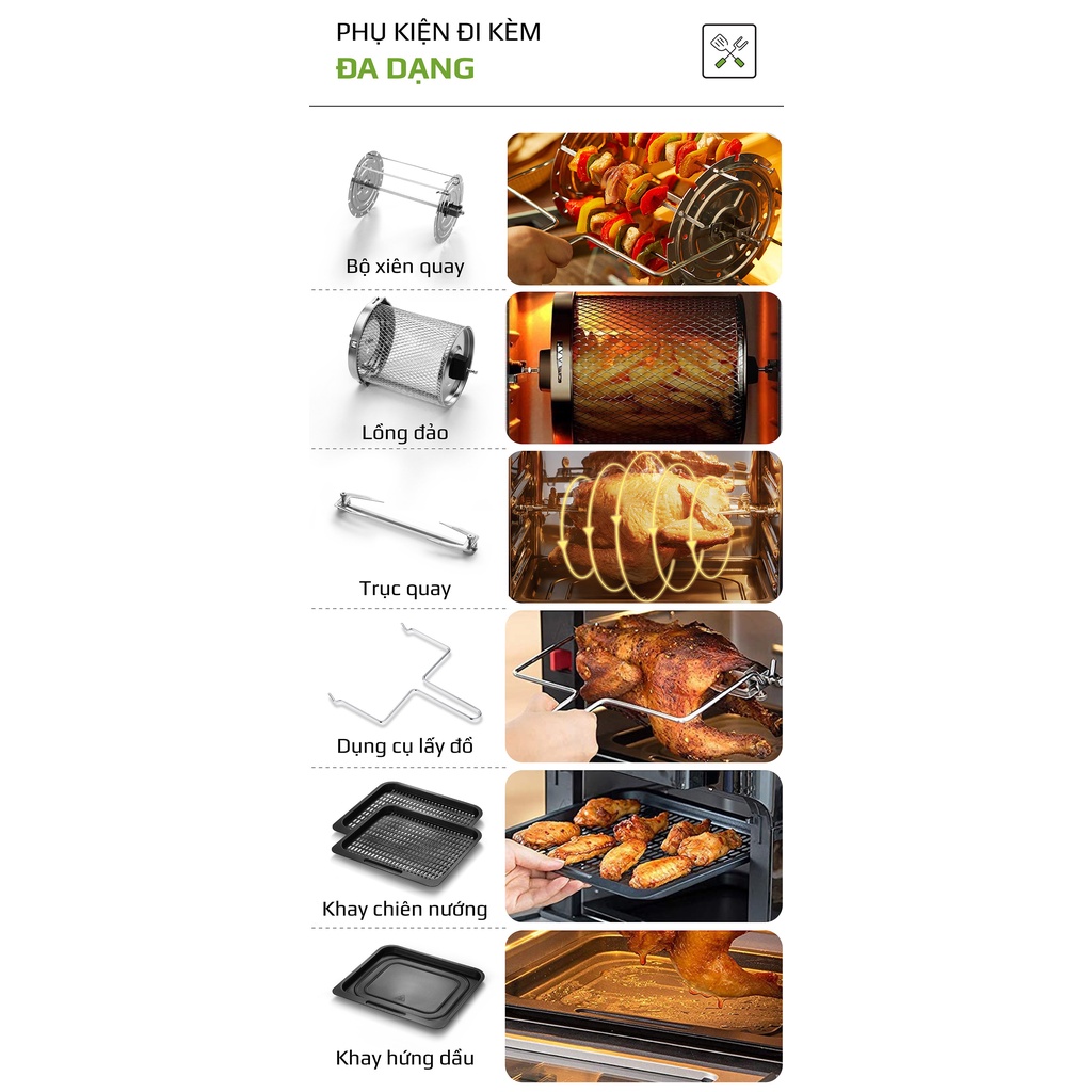 - Phụ kiện đa dạng: Xiên quay, Giỏ/lồng quay, Nhông quay, Dụng cụ lấy đồ, Vỉ nướng chống dính: 2 vỉ, Khay hứng đồ/dầu ăn: 1 khay. Tất cả phụ kiện đều được phủ chất liệu CHỐNG DÍNH HOÀN HẢO, dễ vệ sinh và an toàn tuyệt đối khi sử dụng.