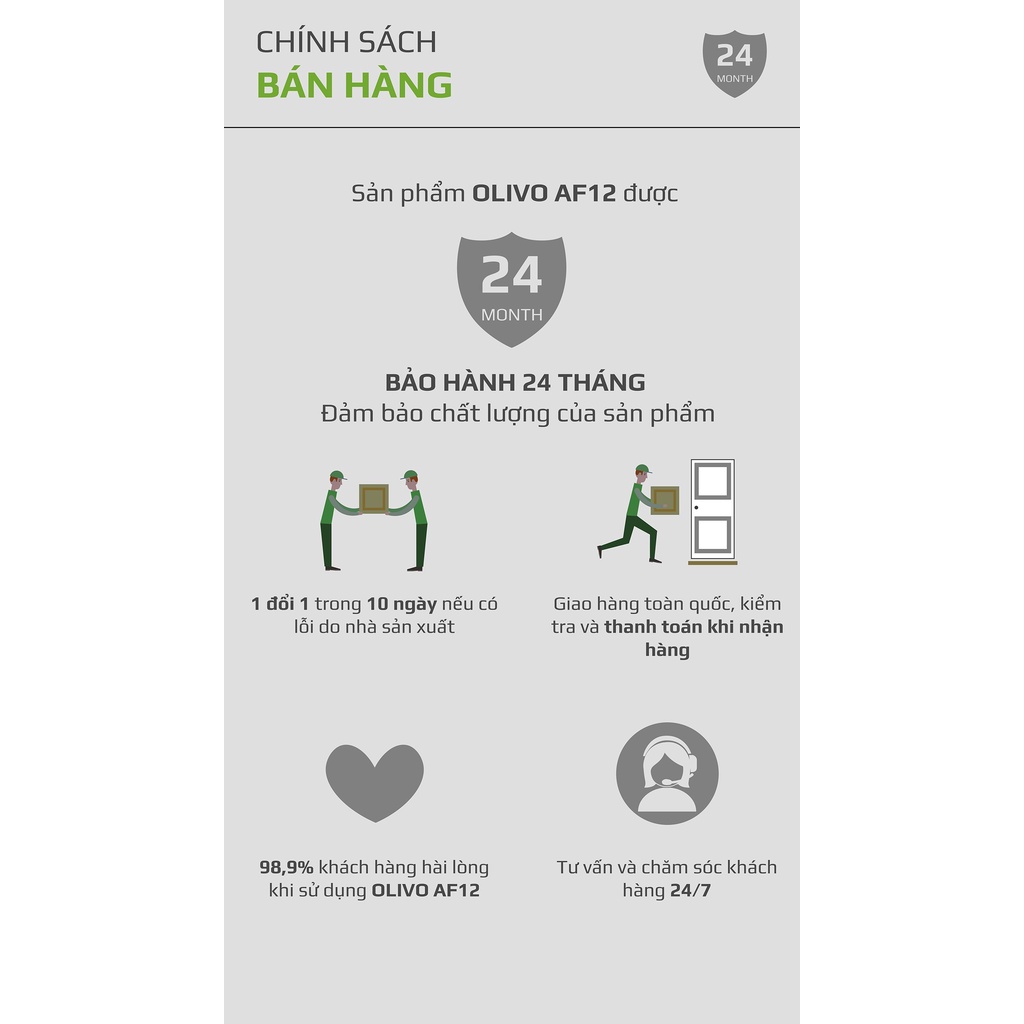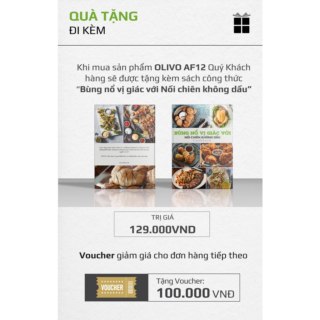 - OLIVO AF12 có tới 8 chương trình nấu ăn được cài đặt sẵn. Với mức nhiệt độ trải dài từ 40ºC đến 200ºC, chiếc nồi chiên không dầu này cho phép bạn Chiên khoai tây, Nướng thịt, Nướng cá, Nướng tôm, Nướng Pizza, Nướng Đùi gà, Nướng bánh, Nướng Gà quay nguyên con, Sấy hoa quả, Rã đông thực phẩm... tất cả đều được tích hợp trong một thiết bị.