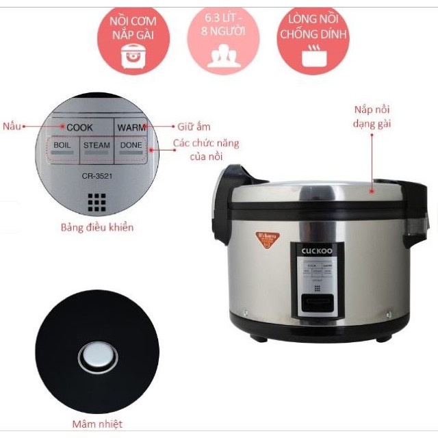 Thiết Bị Điện Gia Dụng > Đồ gia dụng nhà bếp > Nồi cơm điện || [Mã ELHASALE1TR giảm 5% đơn 3TR] [Chính Hãng] Nồi Cơm Điện Công Nghiệp Cuckoo Hàn Quốc 6,3Lit CR3521 BH 2NamCòn hàng