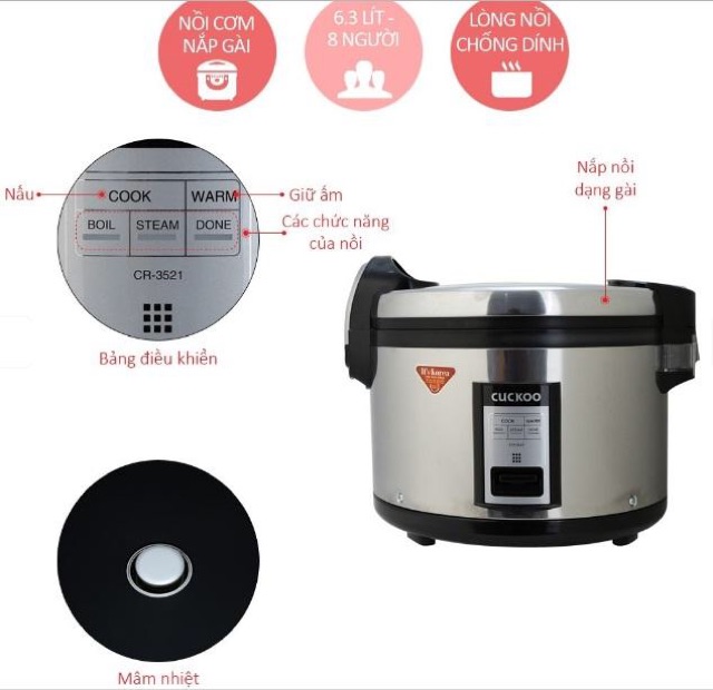 [Mã ELHADEV giảm 4% đơn 300K] [Chính Hãng] Nồi Cơm Điện Công Nghiệp Cuckoo Hàn Quốc 6,3Lit CR3521 BH 2Nam