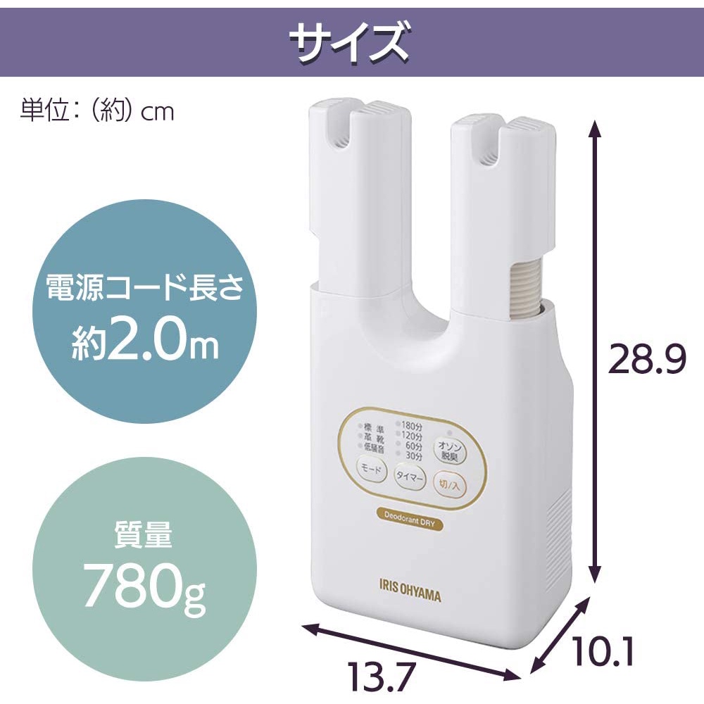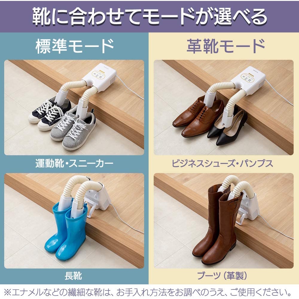 - Đi kèm với chức năng khử mùi ozone để phân hủy và khử mùi hôi. Nó cũng có tác dụng khử trùng. Đi kèm với 3 chế độ tiện lợi (tiêu chuẩn, giày da, và tiếng ồn thấp). Chế độ tiêu chuẩn: Cung cấp không khí ấm khoảng 122 ° F (50 ° C). Sử dụng nó để làm khô giày thể thao, v.v.