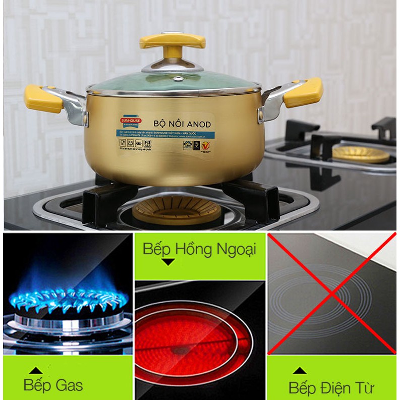 BỘ NỒI ANOD SUNHOUSE SH6634 - SET 3 NỒI MÀU VÀNGCông nghệ ANODIZED (điện phân các anod) là quá trình làm oxy hóa bề mặt của những tấm nhôm tạo thành một lớp vỏ bọc cứng thay cho lớp nhôm thông thường - kết quả cho ra một liên kết nhôm cực mạnh gọi là nhôm Anod. Nhôm Anod có thể cứng gần bằng kim cương và được ứng dụng rất nhiều trong ngành công nghiệp sản xuất ô tô, máy bay, vi tính…