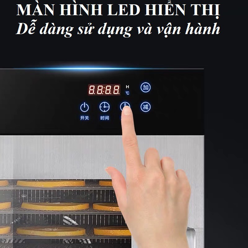 Màn hình Led hiển thị, phím cảm ứng có thể điều chỉnh nhiệt độ, thời gian & tốc độ gió phù hợp với từng loại thực phẩm