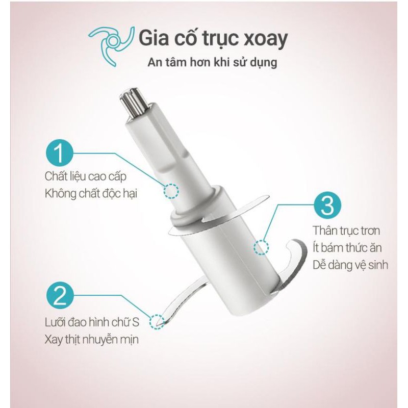 Thiết kế thông minh với 3 lưỡi dao, lực xoay mạnh, dễ dàng xay nhuyễn thức ăn, chuẩn bị đồ ăn cho bé ăn dặm. Có thể xay được các loại thịt, rau củ quả, gia vị hoặc làm sinh tố cho bé