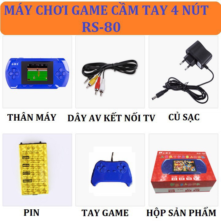 + Máy chơi Game RS-80 gồm 280 trò chơi NES đầy đủ hết các trò chơi ngày xưa làm anh em ta điên đảo, Bây giờ thêm tính năng di động chơi ở bất kỳ đâu, Bụi cây, Toilet, Nóc nhà , Chuồng gà , Sân bóng, Hồ bơi, chỗ nào cũng được hết.