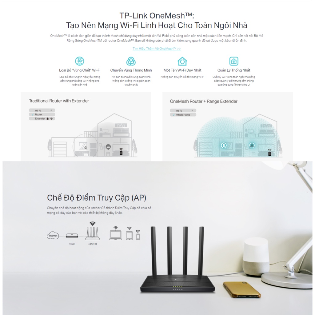 👉 Hỗ trợ One Mesh: Tạo Nên Mạng Wi-Fi Linh Hoạt Cho Toàn Ngôi Nhà, OneMesh™ là cách đơn giản để tạo thành Mesh chỉ dùng duy nhất một tên WI-Fi để phủ sóng toàn căn nhà một cách liền mạch.