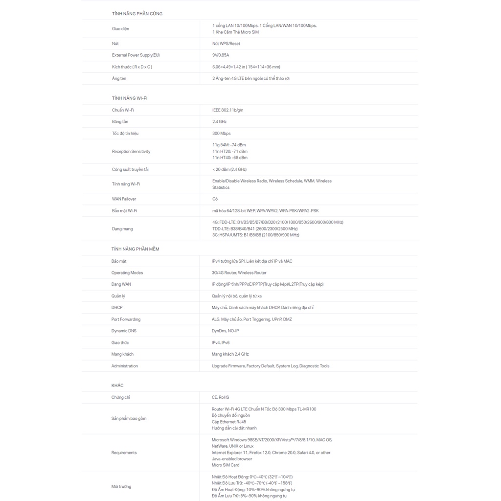 Giới thiệu [Chính Hãng] TP-Link MR100 Phát WiFi 4G Chuẩn N Tốc Độ 300 Mbps